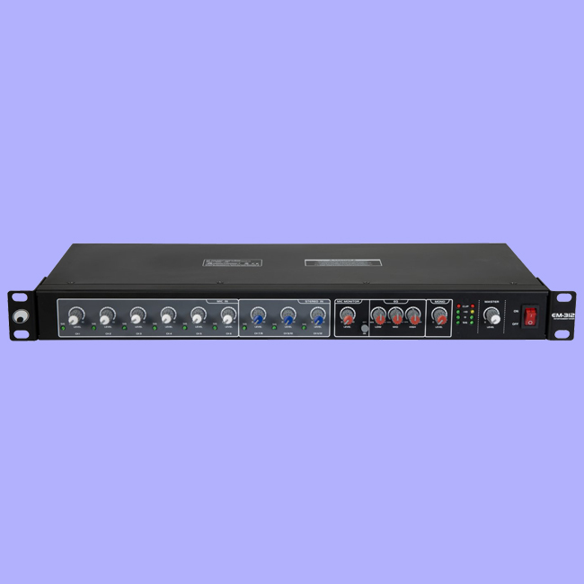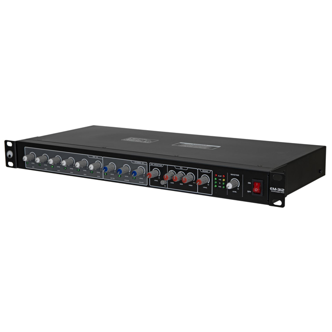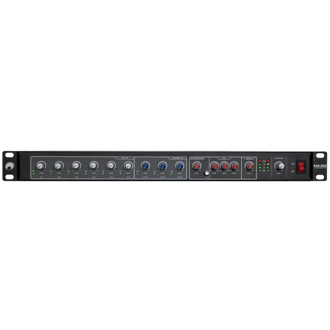 The EM-312 offers separate volume controls for all inputs in addition to volume control for the mono output and a master volume control. It has a 3-band equalizer and an adjustable priority function for microphone announcements through channel 1.