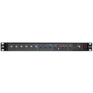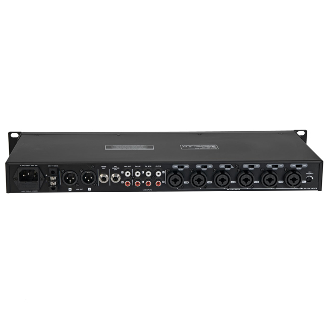 Input chanel: 6 x mono with Mic-line switch via 3-pin XLR/6.35mm jack (F) combination socket (mounting version), channel control via Rotary dial, 3-band tone control EQ 80Hz/2,5kHz/12kHz