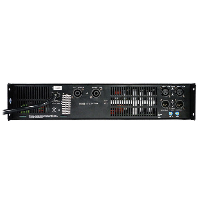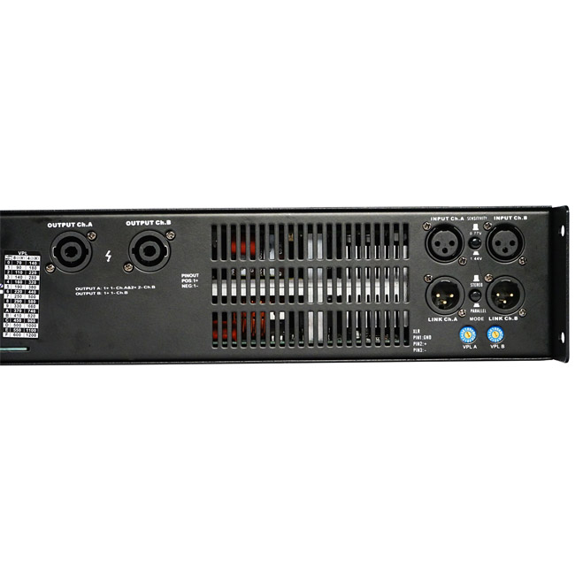 D class high performance 2 channels amplifier, 2 x900 w/8ohms , 2 x 1800w/4 ohms, XLR input, speakon output, led VU meter, temperature control fans, frequency responce 20Hz – 34Kz,adjustable VPL, 11kg.