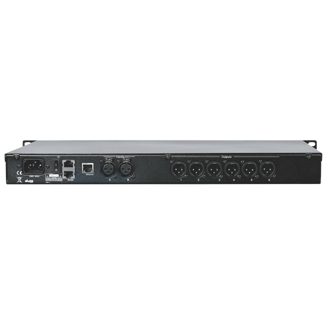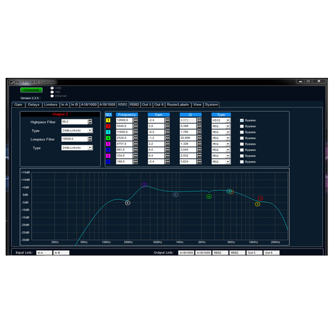 The excellent DSP decoder and 48 bit interior data channel which is for especial for wide dynamic extension and purity sound quality. High sampling rate, low spoilage and dynamic extension. Many opportunities and agility crossover modes, 2 way input and 6 way output with limiter, mute button and 180 phase inverter. Each input channel is with 8 equalizer view (PEQ), each output will be with 8 PEQ. Different filters like Butterworth, Bessel and Linkwitz-Riley for the best sound performance. Internal memory for 30 presets to save. Connection is possible with USB, RS 485 and Ethernet Interface.