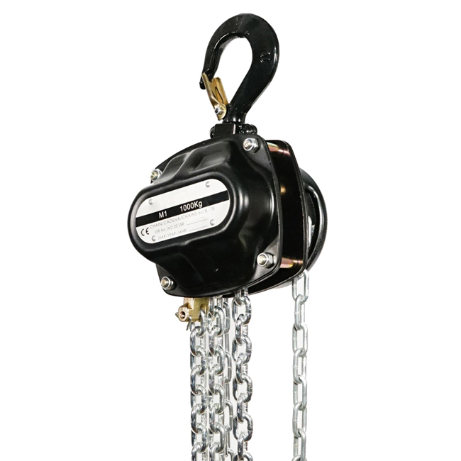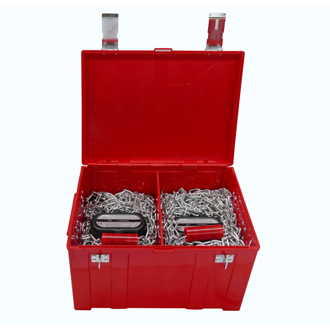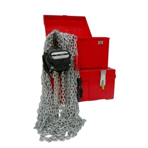 Red box with 2 pcs CE certified manual chain hoists with 9m chain and 1000 kg lifting capacity.