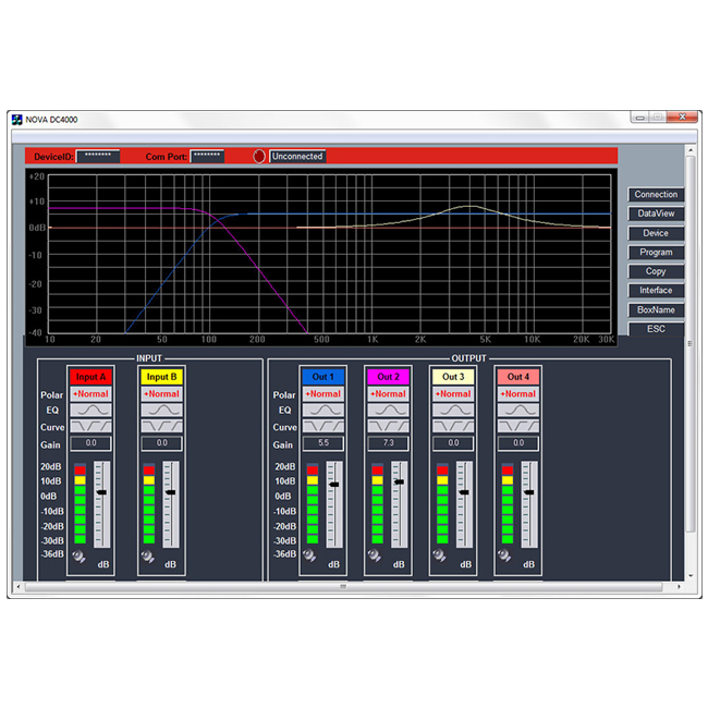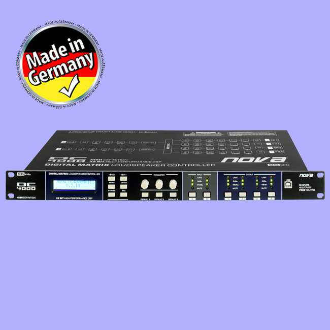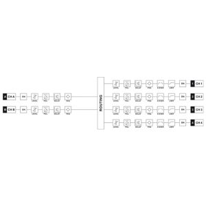 Distortion: < 0.01% Display: 2 x 20 character LCD display with LED background lighting Mains voltage / power consumption: 90 – 250 V (AC) @ 50 – 60 Hz / 20 W Latency: 0,625 ms Maximum power consumption: 15 W Dimensions unit (mm) W x H x D: 483 x 43.6 x 225, 19” format, 1 RU/RS (HE) Weight: 3,5kg