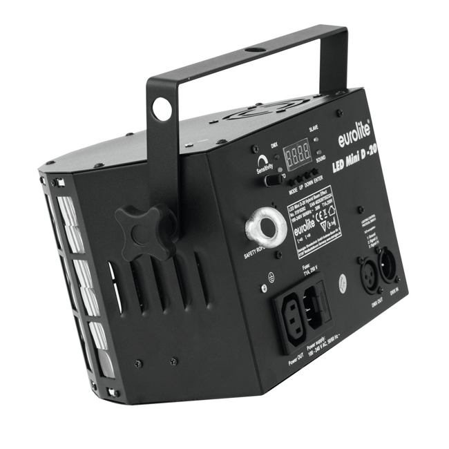 The Mini D-20 can either be controlled via stand-alone mode or connected to a DMX controller. In either way, the high-performance RGBW LEDs even cut through smoky air which makes this derby effect perfectly suitable for light shows of any kind, be it a presentation at a trade fair, a party in a club or a private party. You can choose from multiple different programs such as static colors, sound-controlled lighting effects and rapid strobe effects and more!