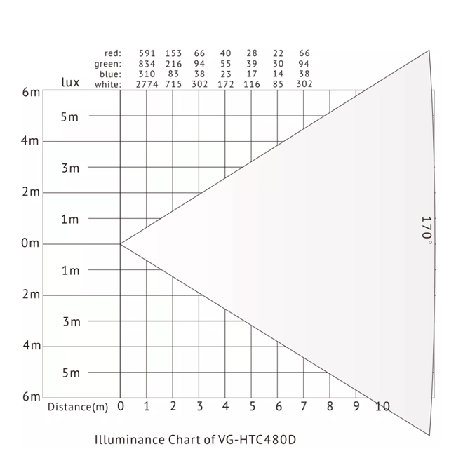 - Iluminance: white: 2774lux@1m; Red: 591lux@1m; Green: 834lux@1m; Blue: 310lux@1m