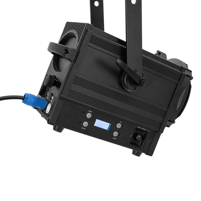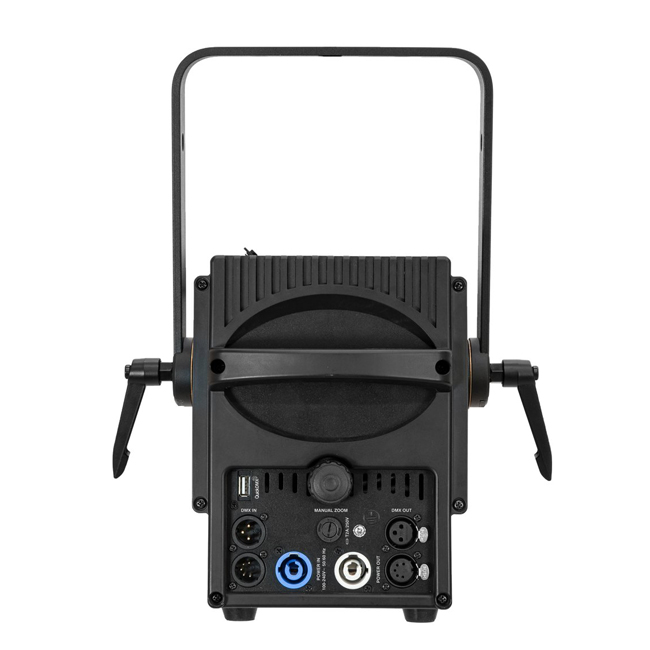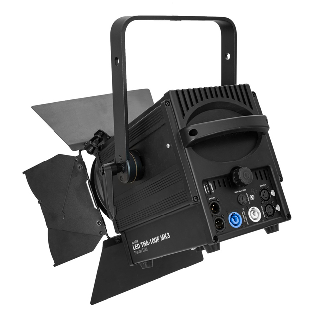 • Fresnel spotlight (fresnel lens), 100 W warm white LED, CRI >90, quiet, DMX