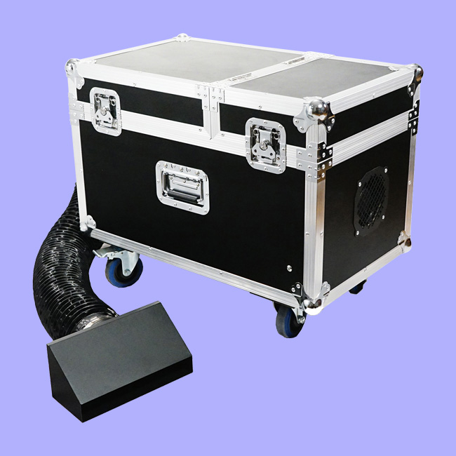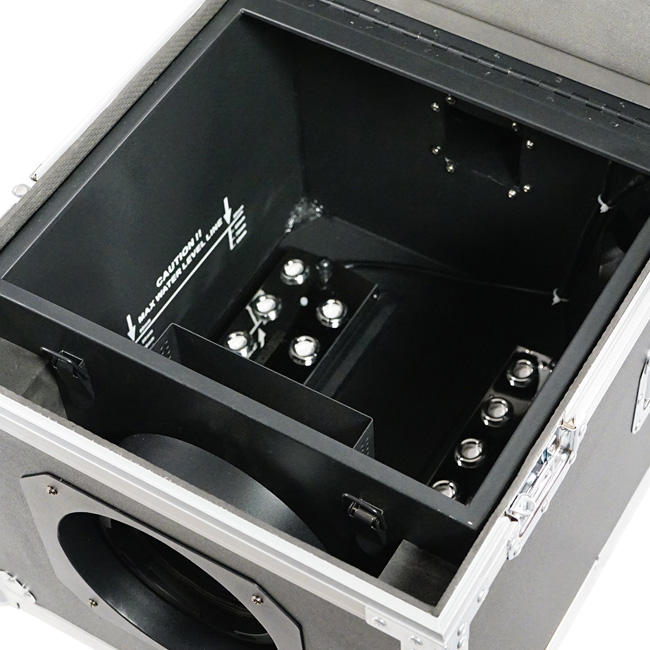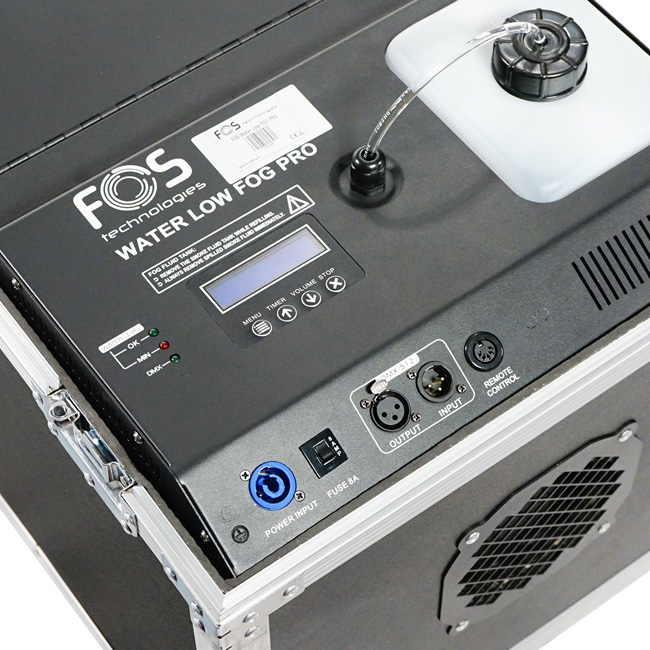 Professional low fog machine, with flightcase. It produces low lying fog with the ultrasonic atomization method. Includes hose and output nozzle. The main tank fills with approximately 10 liters of water (upper and lower water levels are marked inside the tank). In the fog liquid tank, you add the type (water based only) of the liquid you wish*.