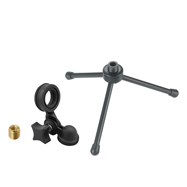 Accessories Included: Pivoting stand mount for 5/8”-27 threaded stands; 5/8”-27 to 3/8”-16 threaded adapter; soft protective pouch; tripod desk stand; 10’ (3.1 m) USB cable