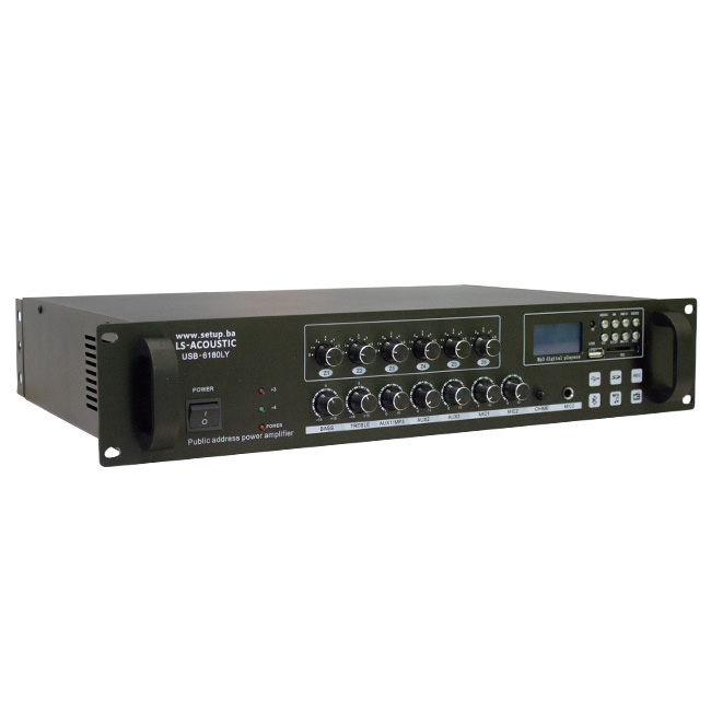 Model USB-6180LY pojačalo pruža snagu od 180 W i savršeno je rješenje za ozvučenje manjih i srednjih prostora – poput kafića, restorana, poslovnih prostora, škola ili konferencijskih sala.