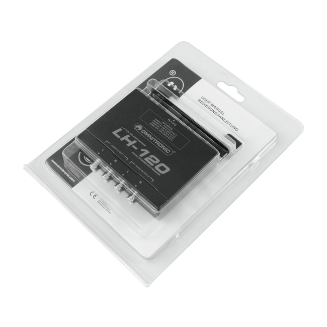 The OMNITRONIC LH-120 is a passive CAT-5 extender which allows transmission of two stereo audio signals over a single network cable (UTP/CAT-5 and higher) in a point-to-point connection.