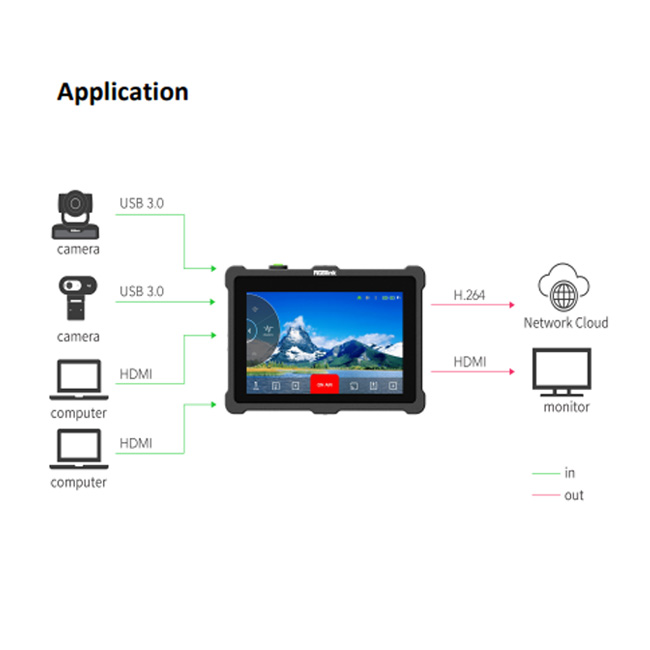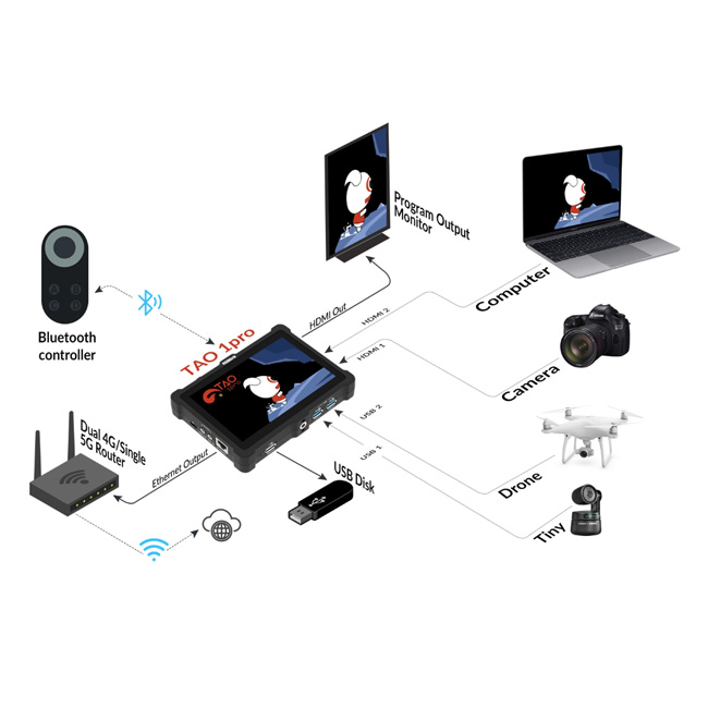 TAO 1pro is a Broadcasting streaming decoder with a 5.5 inch FHD preview display,but also a 4 channels seamless video switcher for 2 USB 3.0 and 2 HDMI 1.3 inputs, and supports streaming directly by ethernet output which is ready to connect to external cloud based router and streaming from Anywhere to Everywhere.
