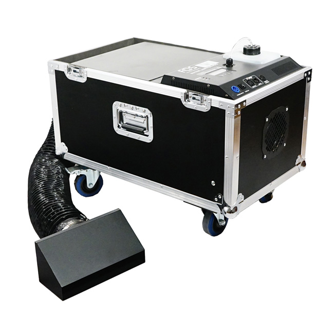 Professional low fog machine, with flightcase. It produces low lying fog with the ultrasonic atomization method. Includes hose and output nozzle. The main tank fills with approximately 10 liters of water (upper and lower water levels are marked inside the tank). In the fog liquid tank, you add the type (water based only) of the liquid you wish*.